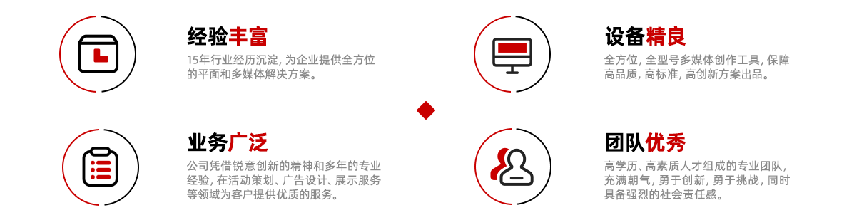 憑借銳意創(chuàng)新的精神和多年的專業經驗,在活動策劃、廣告設計、展示服務等領域為客戶提供優(yōu)質的服務。